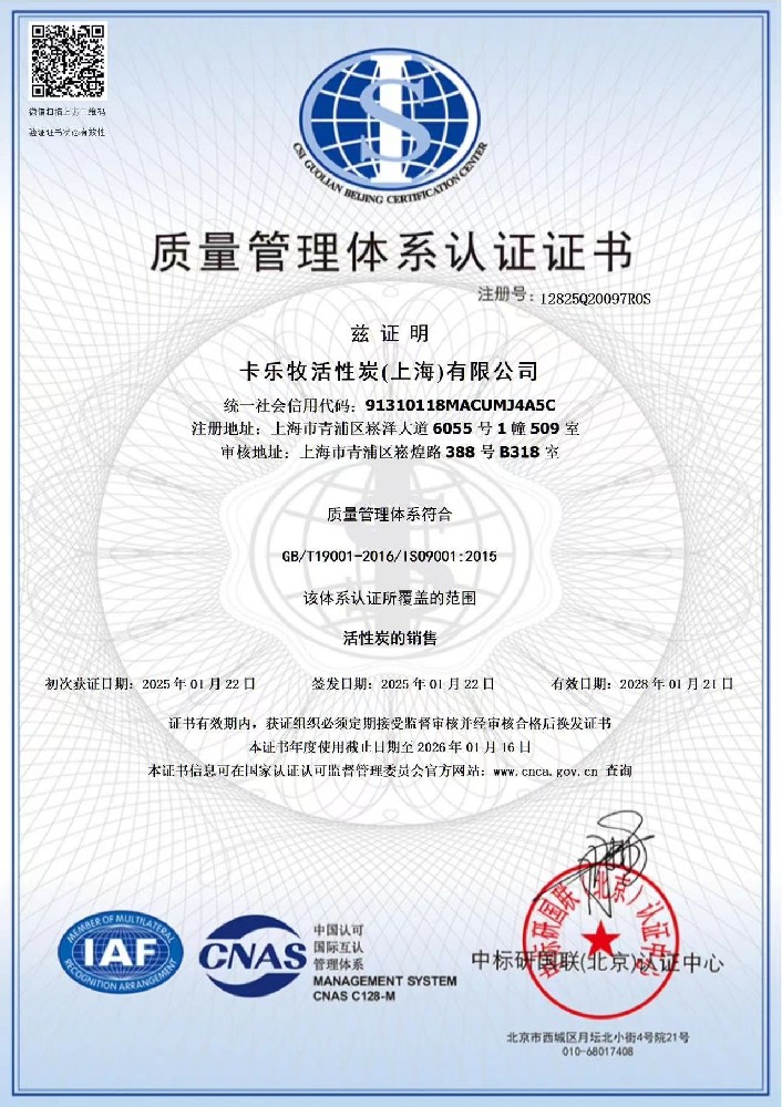 卡乐牧活性炭有CMA认证证书,及环境保护协会认可会员